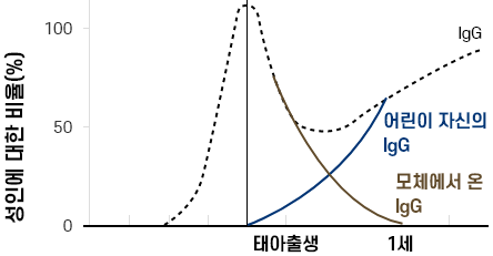 모체로 받은 면역력이 생후 6~8개월 동안 소실되는 것을 그래프의 lgG 수치로 확인할 수 있습니다.